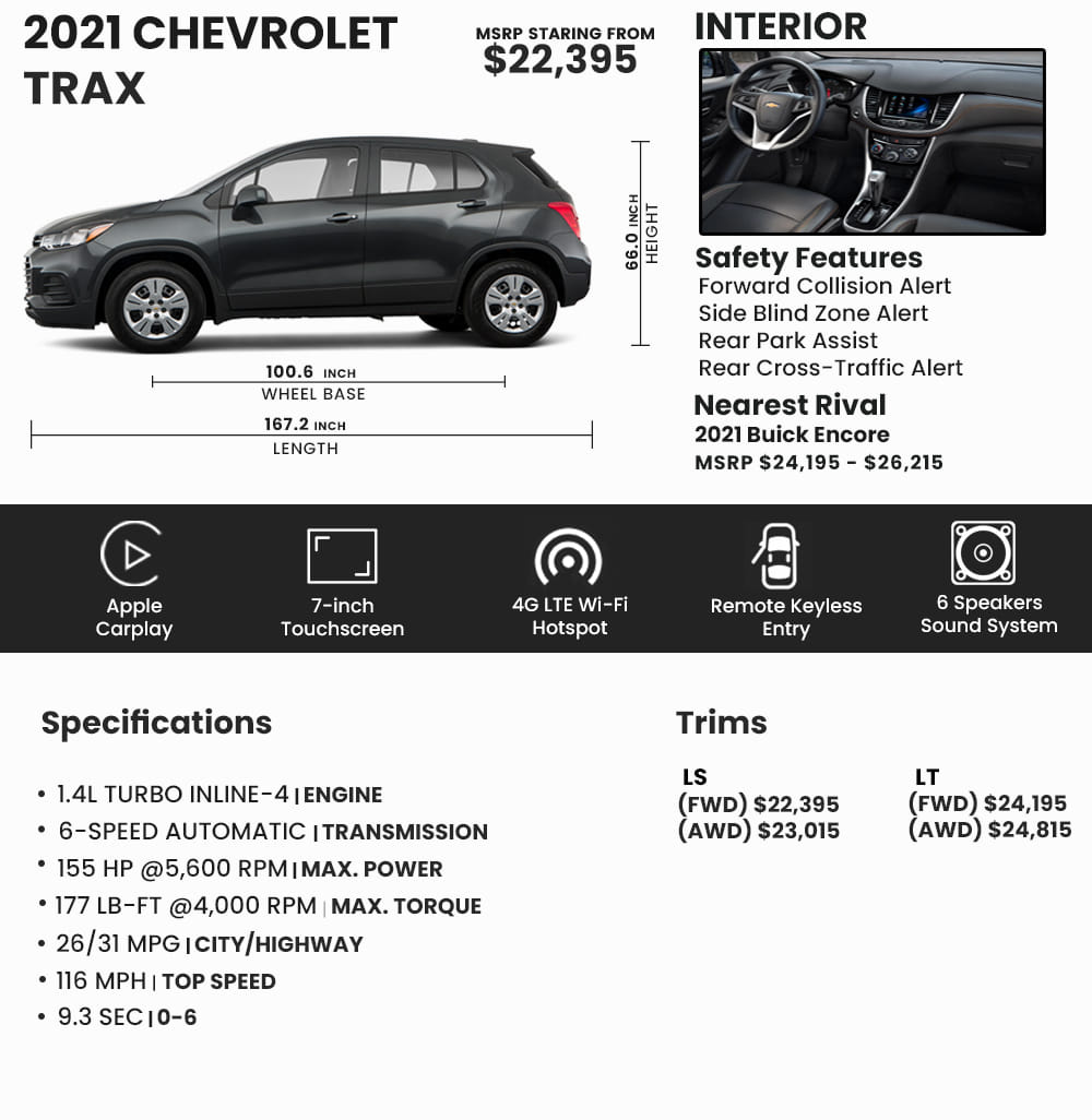 Even though we pointed out beforehand clean 2022 Chevy Trax AWD shades as a variety of the unheard-of probable novelties we might see apart from that the tiny crossover carries on inside the same fashion. Undesirable interior sources influence this modest crossover and equally series of seating might want some. AUDIO SYSTEM CHEVROLET INFOTAINMENT. AUDIO SYSTEM CHEVROLET MYLINK RADIO with 7 diagonal color touch-screen. It is even better when you get the models with the All-Wheel-Drive system. 2721 low range gear373 optional. This forum contains pricing dealer feedback latest incentives and ordering information. Test drive this New Gray 2021 Chevrolet Trax at North Park Chevrolet Castroville difference today. Chevrolet 4G LTE and available built-in Wi-Fi hotspot offers a fast and reliable Internet connection for up to 7 devices.