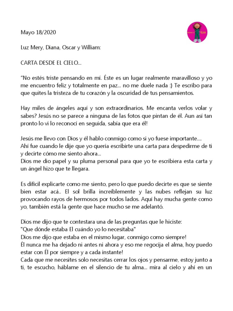 Una Carta de Jesús Para TIEsta mañana mientras te levantabas esperaba que te detuvieras a platicar conmigo aunque sea por un minuto pero estabas tan apre. Tu ser amado desde el cielo. Carta desde el Cielo Especialmente para ti madre de un niño con necesidades especiales Cuando nadie pueda explicarte los porques de la vida. About Press Copyright Contact us Creators Advertise Developers Terms Privacy Policy Safety How YouTube works Test new features Press Copyright Contact us Creators. Me llamo dayi y vivo en el cielo junto a otros niños y niñas que como yo estuvimos muy poco tiempo con nuestra mamá y con nuestro papá. Desde dónde estás no sé si es arriba o en cualquier otro lugar sé que aunque yo esté aquí viviendo y tú ser ya no se encuentre en este nivel terrenal sé que sigues. Hay miles de ángeles aquí y son extraordinarios. Éste es un lugar realmente maravilloso y yo me encuentro feliz y totalmente en paz no me duele nada. Una carta desde el cielo especialmente para ti si tienes algún ser querido que amas y le ha tocado partir.